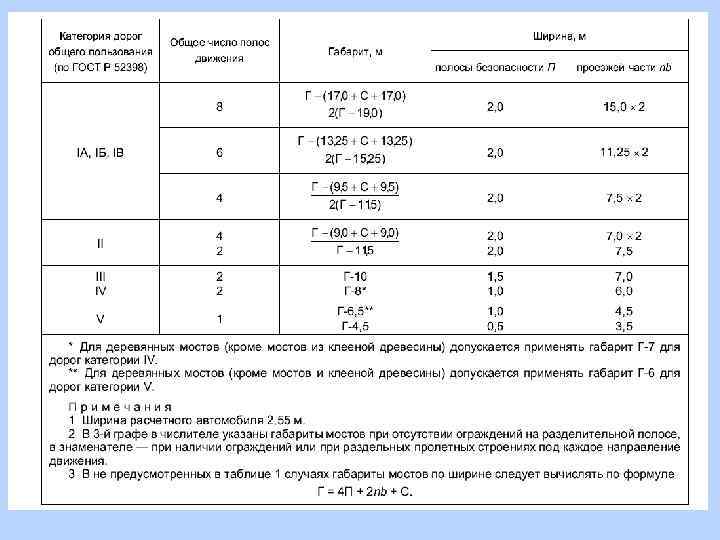 Габариты мостов на автомобильных дорогах и в городах обозначают буквой Г и числом, соответствующим ширине проезжей части nb на мосту и прилегающих к ней предохранительных полос П в метрах (а). При наличии разделительной полосы к обозначению габарита добавляется ее ширина С, причем в ширину разделительной полосы входят прилегающие к ней предохранительные полосы (б). Если мост имеет два раздельных пролетных строения, или на разделительной полосе устраивают специальные ограждения, габарит моста может быть составлен из двух отдельных габаритов (в) и будет обозначаться — 2 Г. Ог— ограждение проезжей части Габариты мостов на автомобильных дорогах Габариты мостов назначают в зависимости от категории автомобильной дороги, на которой расположены эти мосты, числа полос движения n и ширины одной полосы движения b.