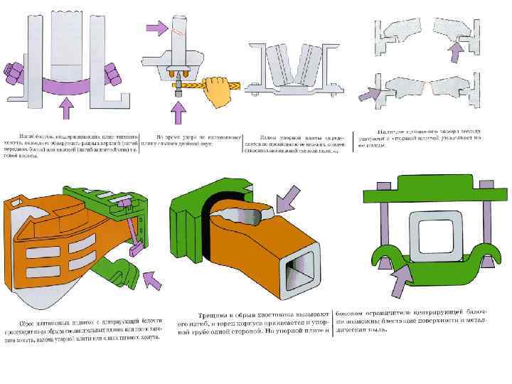 Ремонт деталей автосцепного устройства • • • Разрешается при всех видах ремонта: у корпуса автосцепки и в деталях механизма ремонтировать наплавкой изношенные поверхности А, Б, В, Г, Д; при наплавке износов А, Б контура зацепления сварные швы не должны доходить до мест закруглений ближе, чем на 15 мм. Наплавка поверхностей хвостовика корпуса автосцепки В выполняется при износе от 3 до 8 мм. Перемычку Г хвостовика можно наплавлять, если ее толщина для автосцепки СА 3 не менее 40 мм. Изношенный торец Д корпуса ремонтировать, если его длина меньше 645 мм; заваривать трещины, если их длина не более 20 мм; ремонтировать трещины перемычки Г глубиной не более 8 мм, включая разделку; заваривать трещины корпуса в зоне М от упора до отверстия для клина тягового хомута общей длиной до 100 мм у корпусов, проработавших более 20 лет, и до 150 мм для остальных корпусов; у замка привать сигнальный отросток Е и шип для предохранителя 3, а также перемычку К; заваривать не более одной трещины замкодержателя Е. Наплавку производят электродами ОЗН 400, порошковой проволокой ПП ТН 350, ПП ТН 500, ПП НП 14 СТ. Изгиб хвостовика определяют в соответствии с рисунками. Изгиб более 3 мм, измеренный в средней части хвостовика, правят.