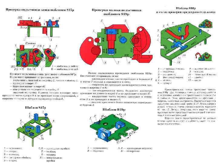 Проверка корпуса автосцепного устройства шаблонами • • • После разборки автосцепки ее детали осматривают и проверяют шаблонами, которые имеют установленные номера и действуют по принципу проходных и непроходных, то есть проходная часть шаблона должна свободно проходить проверяемую часть автосцепки, а непроходная — нет. Зона проверки корпуса шаблонами 892 р, 893 р и 884 р — 80 мм вверх и вниз от литейного шва. При проверке контура зацепления шаблоном 827 р труба шаблона 1 должна располагаться в месте перехода малого зуба в ударную стенку зева 2. Контур годен, если шаблон свободно проходит по всей высоте головы корпуса. Положение шипа для замкодержателя правильно, если шаблон 938 р отверстием 1 надевается на шип, а выступ 2 входит в малое отверстие для валика подъемника.