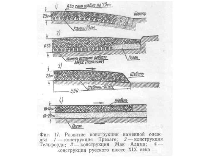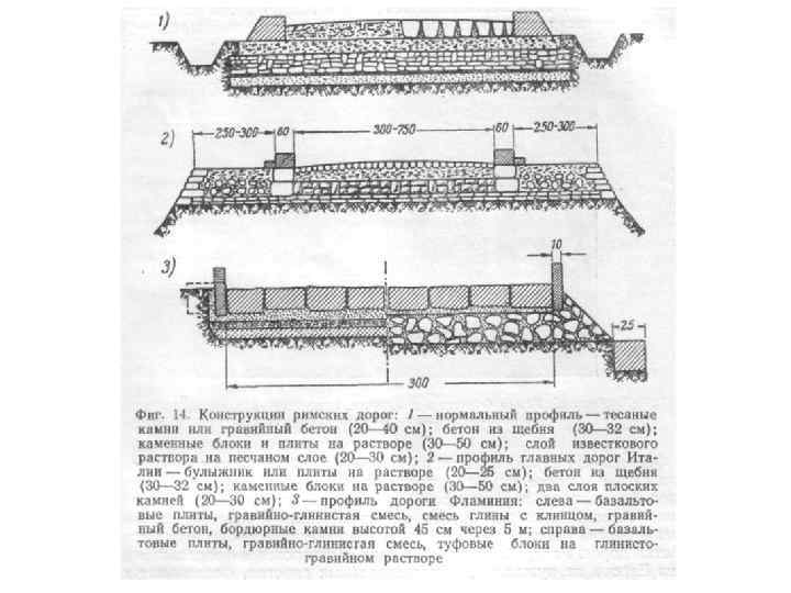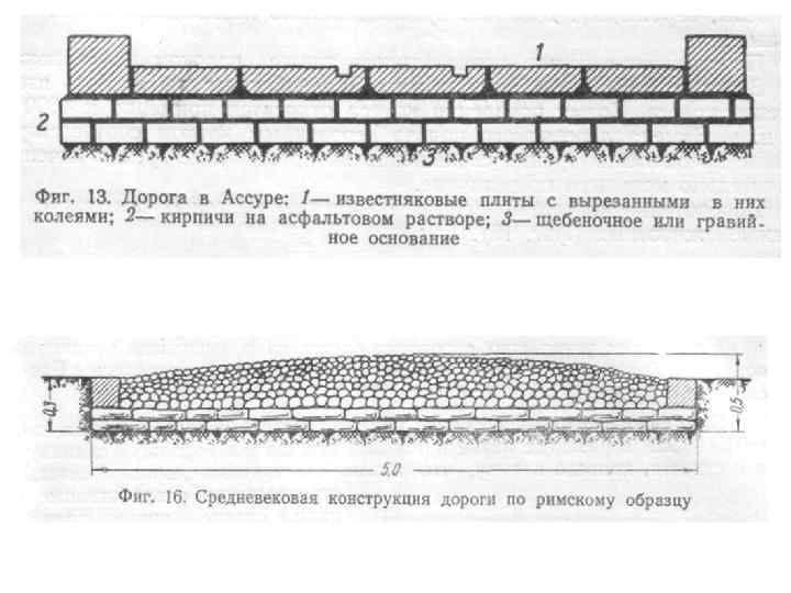 1. 4. Історія застосування будівельних матеріалів та виробів для автомобільних доріг На зорі розвитку людства першими дорогами були стежки на природному ґрунті, потім дороги для в’ючних перевезень і вже пізніше ґрунтові дороги з примітивним покращенням важкопрохідних місць хмизом, жердинами, каменем. Пізніше з розвитком торгових відносин, коли ґрунтові дороги перестали забезпечувати рух в усі пори року, з’явились ділянки доріг з покращенням проїзної частини кам’яним матеріалами в грубоколотому або обтесаному вигляді. Із дорожніх споруд, що збереглися до нашого часу відомі римські дороги ІУ століття. Їх особливістю римських доріг була значна товщина кам’яного шару (до 1 -1, 5 м), наявність місцями піщаного підстилаючого шару. Існують відомості, що вказують на використання таких матеріалів при будівництві доріг як тесані кам’яні плити, опалена глиняна цегла, вапно (2 -у тисячоліття до н. е. ). Таким чином, людство задовго до нашої ери використовувало широкий асортимент будівельних матеріалів, який практично не збільшувався протягом багатьох років.