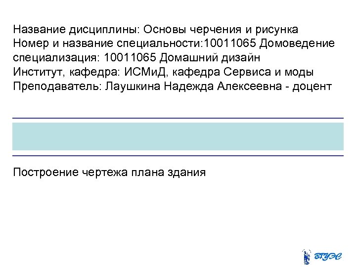 Название дисциплины: Основы черчения и рисунка Номер и название специальности: 10011065 Домоведение специализация: 10011065 Домашний дизайн Институт, кафедра: ИСМи. Д, кафедра Сервиса и моды Преподаватель: Лаушкина Надежда Алексеевна - доцент Построение чертежа плана здания