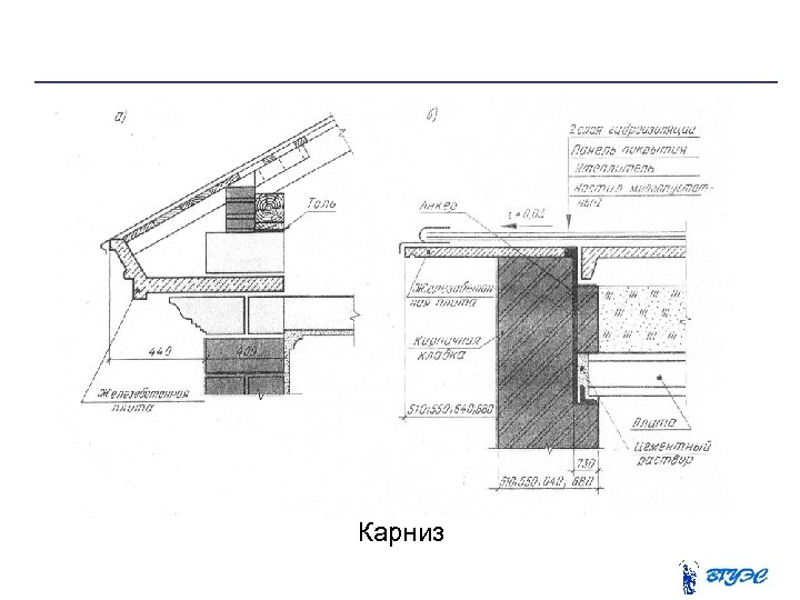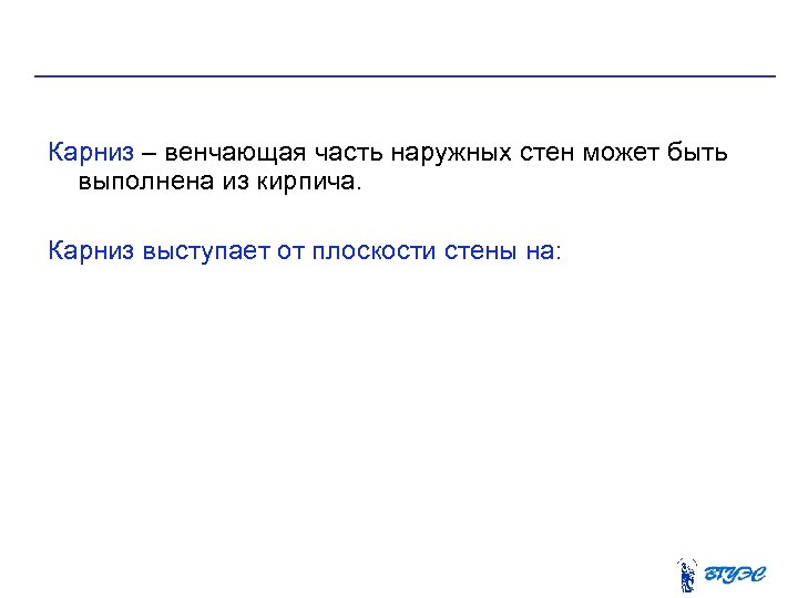 Карниз – венчающая часть наружных стен может быть выполнена из кирпича. Карниз выступает от плоскости стены на:
