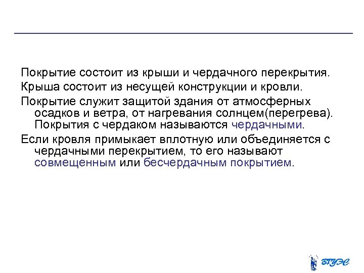 Покрытие состоит из крыши и чердачного перекрытия. Крыша состоит из несущей конструкции и кровли. Покрытие служит защитой здания от атмосферных осадков и ветра, от нагревания солнцем(перегрева). Покрытия с чердаком называются чердачными. Если кровля примыкает вплотную или объединяется с чердачными перекрытием, то его называют совмещенным или бесчердачным покрытием.