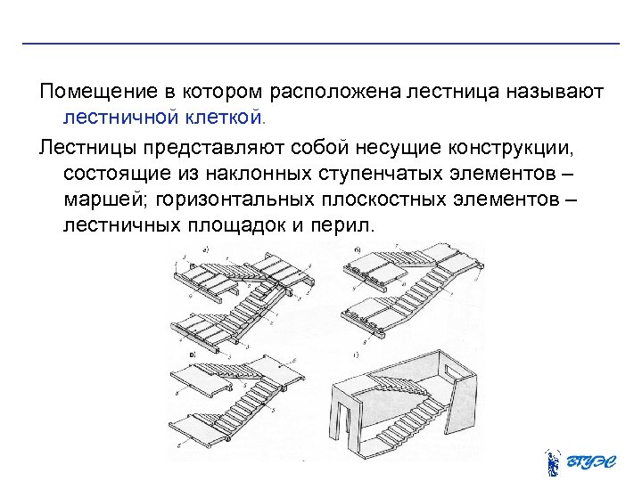 Помещение в котором расположена лестница называют лестничной клеткой. Лестницы представляют собой несущие конструкции, состоящие из наклонных ступенчатых элементов – маршей; горизонтальных плоскостных элементов – лестничных площадок и перил.