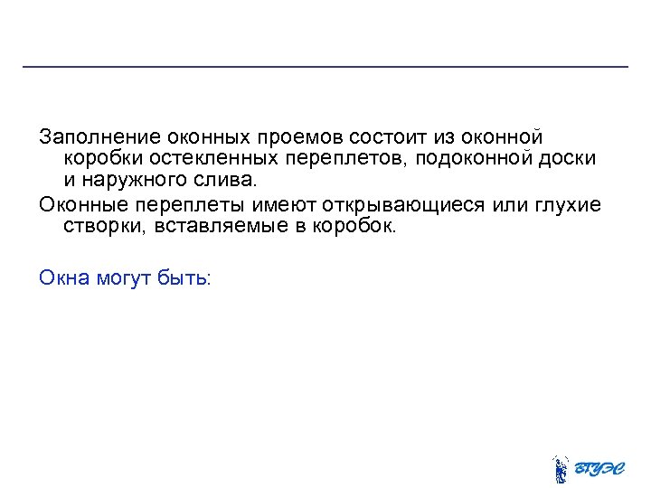 Заполнение оконных проемов состоит из оконной коробки остекленных переплетов, подоконной доски и наружного слива. Оконные переплеты имеют открывающиеся или глухие створки, вставляемые в коробок. Окна могут быть: