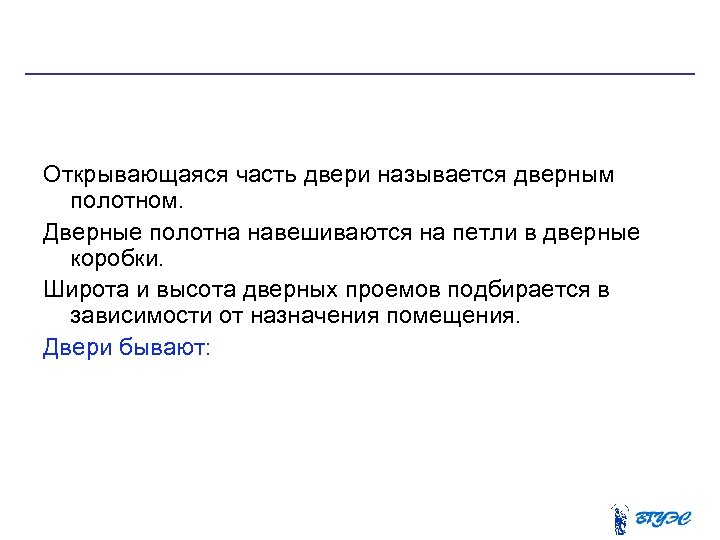 Открывающаяся часть двери называется дверным полотном. Дверные полотна навешиваются на петли в дверные коробки. Широта и высота дверных проемов подбирается в зависимости от назначения помещения. Двери бывают: