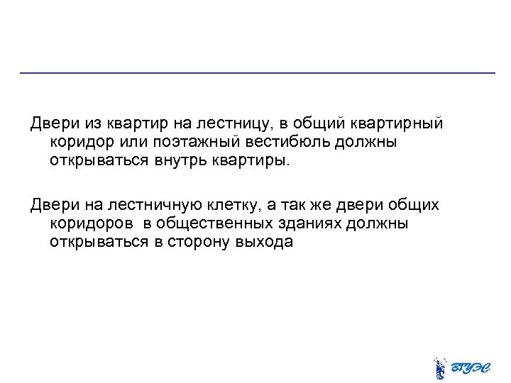 Двери из квартир на лестницу, в общий квартирный коридор или поэтажный вестибюль должны открываться внутрь квартиры. Двери на лестничную клетку, а так же двери общих коридоров в общественных зданиях должны открываться в сторону выхода