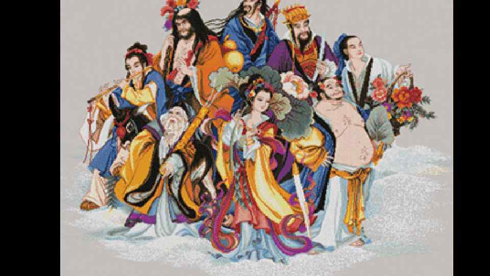 ДАОСИЗМ Восемь Бессмертных переплывают море. По часовой стрелке от кормы: Хэ Сяньгу, Хань Сянцзы, Лань Цайхэ, Ли Тегуай, Люй Дунбинь, Чжунли Цюань, Цао Гоцзю, снаружи Чжан Голао.