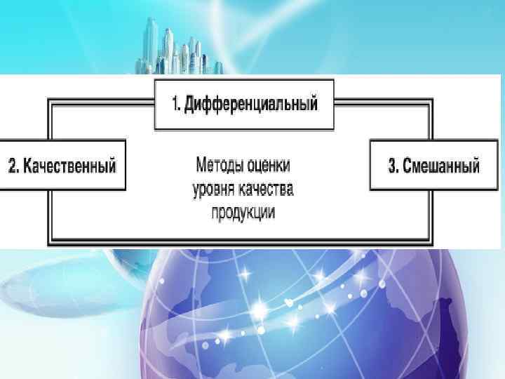 Дифференциальный метод — основан на использовании единичных показателей, чтобы определить, по каким из них достигнут уровень базового образца и значения каких наиболее отличаются от базовых. Качественный метод — основан на применении обобщенного показателя качества продукции, который представляет собой функцию от единичных показателей Смешанный метод — основан на одновременном использовании единичных и комплексных (обобщенных) показателей оценки качества продукции. Он применяется в тех случаях, когда совокупность единичных показателей является достаточно обширной