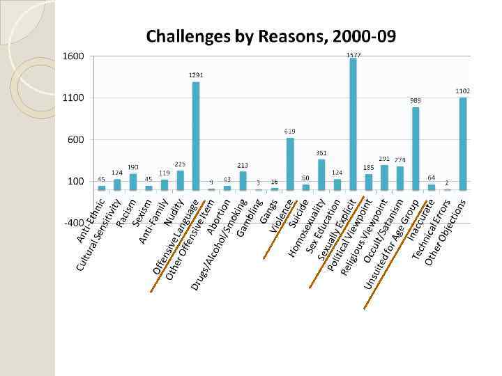 Почему запрещают книги? 1) The Absolutely True Diary of a Part-Time Indian, by Sherman Alexie Причины: - Разрушает семейные ценности - Отсутствие толерантного отношения к различным культурам - Алкоголь, наркотики, сигареты - Игорный бизнес - Оскорбительный язык, богохульство - Сексуальный подтекст - Жестокость - Сцены запугивания подростков - Трагическая смерть большого числа персонажей - Намеки на психическую неполноценность