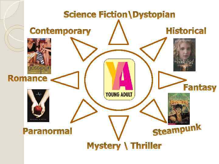 Young Adult Literature = YA Oliver Twist Alice in Wonderland The Adventures of Tom Sawyer Adventures of Huckleberry Finn The Jungle Book Treasure Island The Hobbit Pride and Prejudice Bridge to Terabithia The Book Thief The Catcher in the Rye Lord of the Flies Harry Potter series The Twilight Saga The Hunger Games trilogy The Little Prince Charlie and the Chocolate Factory To Kill a Mockingbird The Fault in Our Stars The Absolutely True Diary of a Part-Time Indian