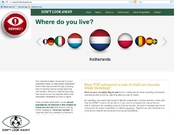 Междуинституционално сътрудничество в Холандия Кампания: - Повишаване обществената осведоменост - Подобряване на качеството и количеството на докладите Паргньори: - Министерство на сигурността и правосъдието - Кралско полицейско летище - ANVR (браншова организация) - НПО (ECPAT, Plan Netherlands, Terre des Hommes, Free a Girl) - Туристически компании (TUI, ACCOR) Начало: - 2010 + 2012 + 2015 Работна група: За подобряване сътрудничеството между полицията, прокурата и неправителствените организации