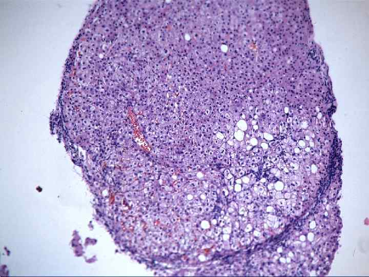 Гистологическая картина НАСГ § Жировая дистрофия (крупно- и мелкокапельная) § Воспалительная инфильтрация (нейтрофилы, лимфоциты, макрофаги) § Фиброз (преимущественно перивенулярный) § Дополнительные признаки: тельца Мэллори, фокальные центролобулярные некрозы, отложение железа