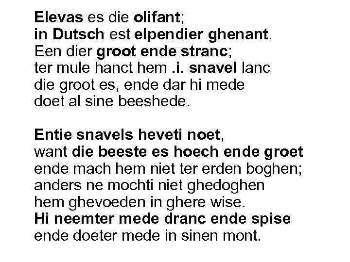 Elevas es die olifant; in Dutsch est elpendier ghenant. Een dier groot ende stranc; ter mule hanct hem. i. snavel lanc die groot es, ende dar hi mede doet al sine beeshede. Entie snavels heveti noet, want die beeste es hoech ende groet ende mach hem niet ter erden boghen; anders ne mochti niet ghedoghen hem ghevoeden in ghere wise. Hi neemter mede dranc ende spise ende doeter mede in sinen mont.