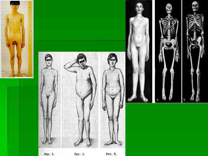 Жалобы на утомляемость, сонливость, резкую прибавку массы тела, снижение работоспособности и т. д. Кожа нередко сухая, бледная. Лицо округлое. У мальчиков отложение жира по женскому типу (шея, плечи, грудь, живот, область таза и бедер, ягодицы). Волосы на лице и теле отсутствуют. Отмечается гинекомастия, нередко наблюдается задержка роста. Внутренние органы обычно не изменены. У мальчиков малые размеры мошонки, полового члена, яичек. Нередко наблюдается крипторхизм. Вторичные половые признаки отсутствуют.