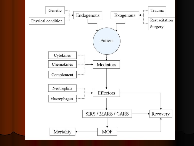 Общие звенья патогенеза любого шока по Alexander, M.F., Fawcett, J.N., Runciman, P.J. (2004) Nursing Practice. Hospital and Home. The Adult.(2nd edition). Edinburgh: Churchill Livingstone Компенсированная (непрогрессирующая) стадия – С-А. централизация 2. декомпенсированная (прогрессирующая) стадия – вторичные медиаторы (сист. Действие медиаторов и метаболитов тканевой гипоксии) 3. Терминальная (необратимая) – микроциркуляторное русло по всему организму ведет себя как при тотальном воспалении В 1999 г. ваш лектор позволил себе охарактеризовать шок, как ОРГАНИЗМИТ