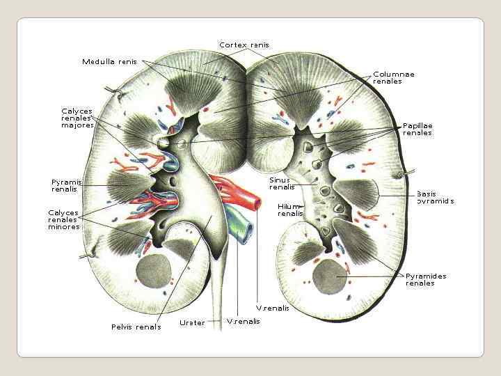 Нефрон: сосудистый клубочек, проксимальный отдел канальцев, петля Генле, дистальный отдел канальцев, собирательные трубки. Сосудистый клубочек: эндотелий капилляров, базальная мембрана, подоциты, капсула (мембрана и эпителий) Почечные канальцы: главный (проксимальный) каналец, петля Генле, дистальный каналец, собирательная трубка. Кровеносная система: кортикальный и юкстамедуллярный круги. Функциональная анатомия почек.