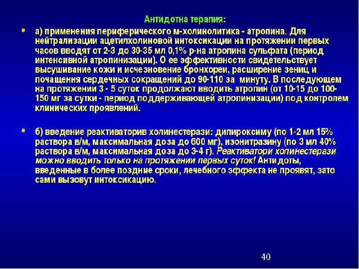 Специфическое лечение При отравлении красным мухомором противоядием является атропин, инъекции которого 0, 1 % раствора по 1 мл под кожу следует повторять З-4 раза с интервалами в 30 -40 минут. Для снятия спазма бронхов — изадрин, эуфиллин в обычных дозах. Из аналептиков полезен кофеин. Противопоказаны кислоты и кислые продукты внутрь, способствующие всасыванию содержащегося в красном мухоморе алколоида мускарина. Лечение при отравлении пантерным мухомором (похож на шампиньон и зонт съедобный) аналогично лечению при отравлении растениями, содержащими атропин и скополамин. При отравления бледной поганкой, а также ложными опятами, сатанинским, грибами-млечниками (грузди, горькуши, свинушки, волнушки) лечение в первую очередь направлено на ликвидацию обезвоживания и коллапса. Применяются различные плазмозаменители: раствор Рингера, изотонический раствор хлорида натрия, солевой инфузип, полиглюкин и т. д. в объеме не менее З — 5 л в сутки в вену капельно. Используют норадреналин или мезатон для повышения кровяного давления, для предотвращения или ослабления поражения печени — гидрокортизон или аналогичные препараты, антибиотики широкого спектра действия.