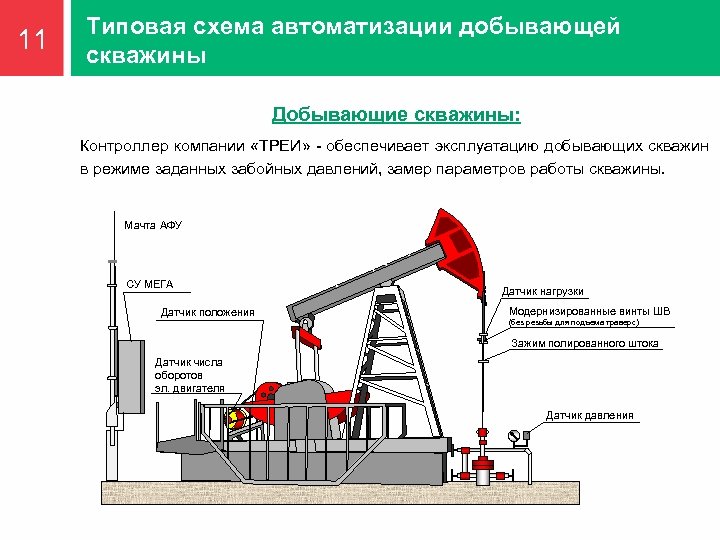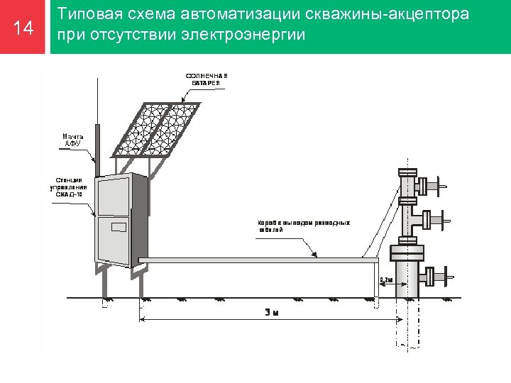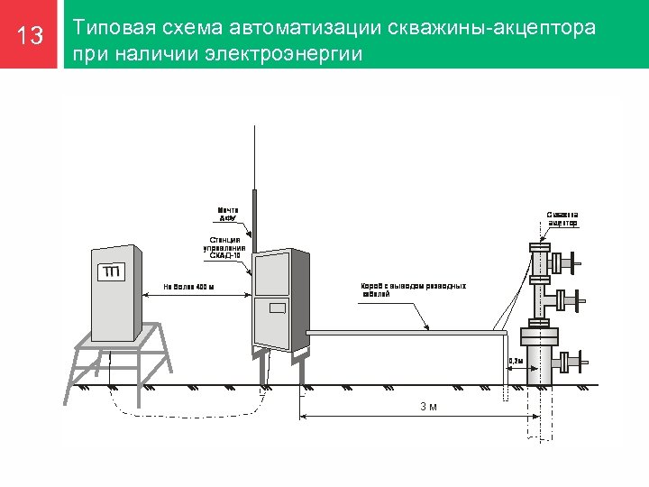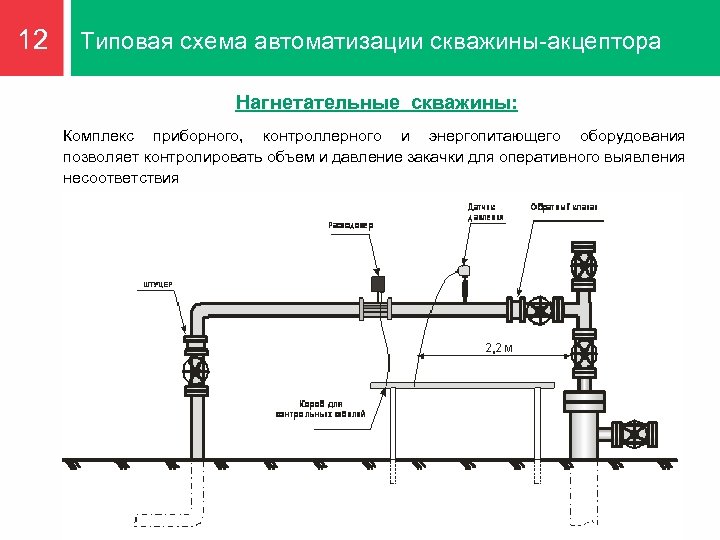 12 Типовая схема автоматизации скважины-акцептора Нагнетательные скважины: Комплекс приборного, контроллерного и энергопитающего оборудования позволяет контролировать объем и давление закачки для оперативного выявления несоответствия