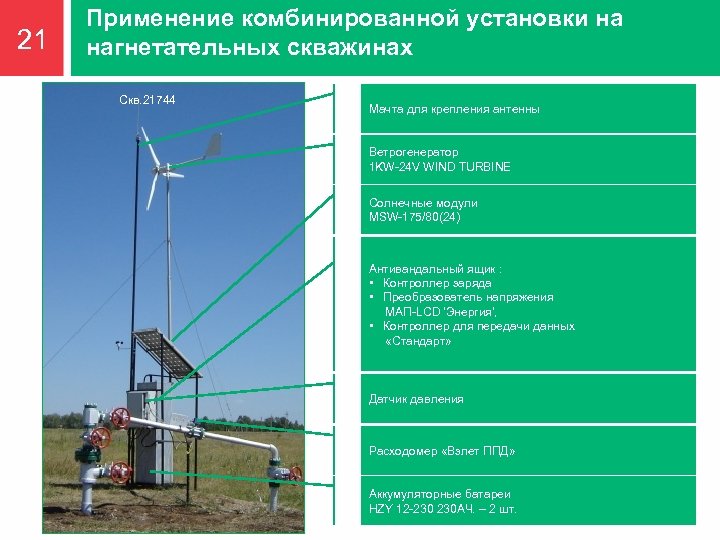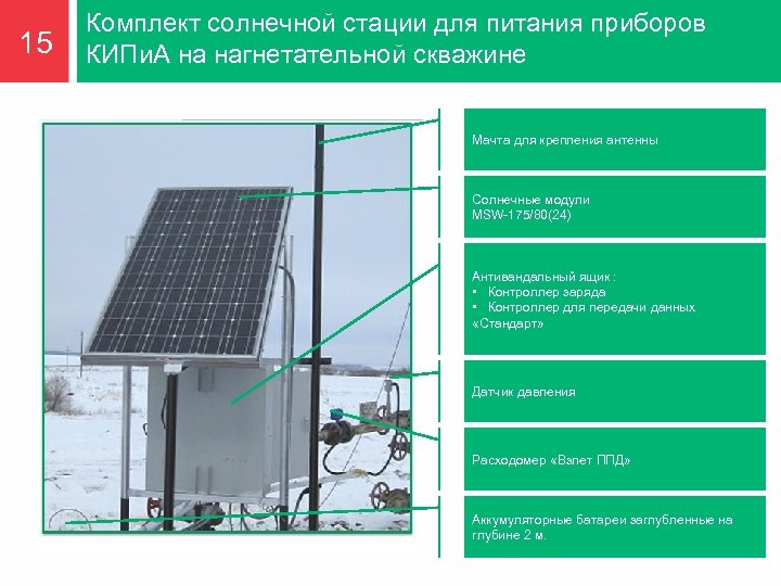 15 Комплект солнечной стации для питания приборов КИПи. А на нагнетательной скважине Скв. 21744 Мачта для крепления антенны Солнечные модули MSW-175/80(24) Антивандальный ящик : • Контроллер заряда • Контроллер для передачи данных «Стандарт» Датчик давления Расходомер «Взлет ППД» Аккумуляторные батареи заглубленные на глубине 2 м.