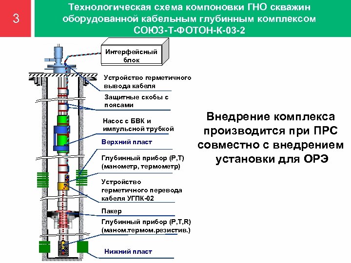 3 Технологическая схема компоновки ГНО скважин оборудованной кабельным глубинным комплексом СОЮЗ-Т-ФОТОН-К-03 -2 Интерфейсный блок Устройство герметичного вывода кабеля Защитные скобы с поясами Насос с БВК и импульсной трубкой Верхний пласт Глубинный прибор (Р, Т) (манометр, термометр) Устройство герметичного перевода кабеля УГПК-02 Пакер Глубинный прибор (Р, Т, R) (маном. термом. резистив. ) Нижний пласт Внедрение комплекса производится при ПРС совместно с внедрением установки для ОРЭ