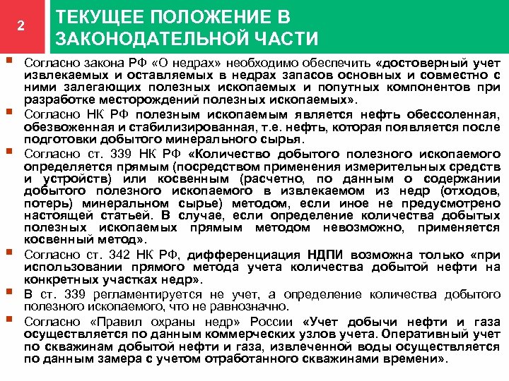 2 § § § ТЕКУЩЕЕ ПОЛОЖЕНИЕ В ЗАКОНОДАТЕЛЬНОЙ ЧАСТИ Согласно закона РФ «О недрах» необходимо обеспечить «достоверный учет извлекаемых и оставляемых в недрах запасов основных и совместно с ними залегающих полезных ископаемых и попутных компонентов при разработке месторождений полезных ископаемых» . Согласно НК РФ полезным ископаемым является нефть обессоленная, обезвоженная и стабилизированная, т. е. нефть, которая появляется после подготовки добытого минерального сырья. Согласно ст. 339 НК РФ «Количество добытого полезного ископаемого определяется прямым (посредством применения измерительных средств и устройств) или косвенным (расчетно, по данным о содержании добытого полезного ископаемого в извлекаемом из недр (отходов, потерь) минеральном сырье) методом, если иное не предусмотрено настоящей статьей. В случае, если определение количества добытых полезных ископаемых прямым методом невозможно, применяется косвенный метод» . Согласно ст. 342 НК РФ, дифференциация НДПИ возможна только «при использовании прямого метода учета количества добытой нефти на конкретных участках недр» . В ст. 339 регламентируется не учет, а определение количества добытого полезного ископаемого, что не равнозначно. Согласно «Правил охраны недр» России «Учет добычи нефти и газа осуществляется по данным коммерческих узлов учета. Оперативный учет по скважинам добытой нефти и газа, извлеченной воды осуществляется по данным замера с учетом отработанного скважинами времени» .