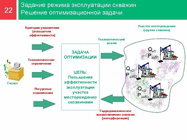 21 Решаемые задачи 1. Регулирования заводнения на основе информации по поскважинной закачке пластовой воды (приемистость, давление закачки). 2. Эксплуатации добывающих скважин с нестабильным пластовым давлением в режиме заданных забойных давлений с дополнительным контролем их дебитов. 3. Подбора оптимальных режимов эксплуатации добывающих скважин (забойное давление) и нагнетательных скважин (изменение режимов эксплуатации). 4. Применение опережающих оперативных мер по оптимизации режимов эксплуатации добывающих и нагнетательных скважин.