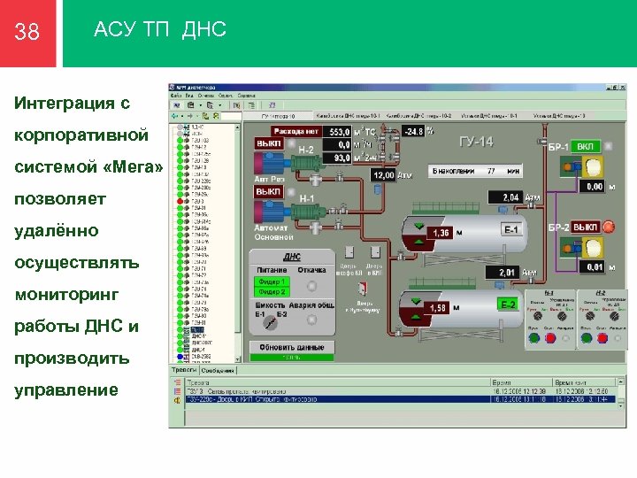 38 АСУ ТП ДНС Интеграция с корпоративной системой «Мега» позволяет удалённо осуществлять мониторинг работы ДНС и производить управление