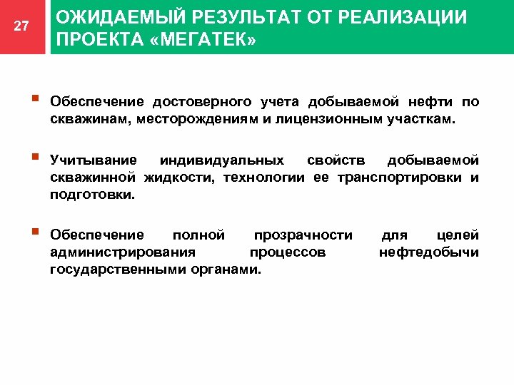 ОЖИДАЕМЫЙ РЕЗУЛЬТАТ ОТ РЕАЛИЗАЦИИ ПРОЕКТА «МЕГАТЕК» 27 § Обеспечение достоверного учета добываемой нефти по скважинам, месторождениям и лицензионным участкам. § Учитывание индивидуальных свойств добываемой скважинной жидкости, технологии ее транспортировки и подготовки. § Обеспечение полной прозрачности администрирования процессов государственными органами. для целей нефтедобычи