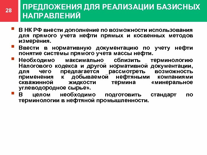 28 § § ПРЕДЛОЖЕНИЯ ДЛЯ РЕАЛИЗАЦИИ БАЗИСНЫХ НАПРАВЛЕНИЙ В НК РФ внести дополнение по возможности использования для прямого учета нефти прямых и косвенных методов измерения. Ввести в нормативную документацию по учету нефти понятие системы прямого учета массы нефти. Необходимо максимально сблизить терминологию Налогового кодекса и другой нормативной документации, для чего предлагается рассмотреть возможность применения к добываемой нефтяными компаниями скважинной жидкости термина «минеральное углеводородное сырье» . В целом необходимо подготовить стандарт по терминологии в нефтяной промышленности.