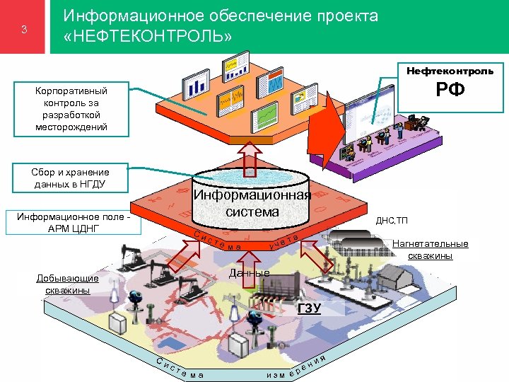 3 Информационное обеспечение проекта «НЕФТЕКОНТРОЛЬ» Нефтеконтроль РФ Корпоративный контроль за разработкой месторождений Сбор и хранение данных в НГДУ Информационная система Информационное поле АРМ ЦДНГ Си ст е ма уче ДНС, ТП та Нагнетательные скважины Данные Добывающие скважины ГЗУ Си ст е ма изм ер и ен я