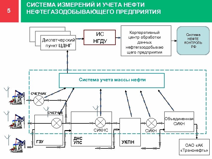 5 СИСТЕМА ИЗМЕРЕНИЙ И УЧЕТА НЕФТИ НЕФТЕГАЗОДОБЫВАЮЩЕГО ПРЕДПРИЯТИЯ ИС НГДУ Диспетчерский пункт ЦДНГ Корпоративный центр обработки данных нефтегазодобываю щего предприятия Система НЕФТЕ КОНТРОЛЬ РФ Система учета массы нефти СЧЕТЧИК Объединенная СИКНС ГЗУ ДНС УПС СИКН УКПН ОАО «АК «Транснефть»