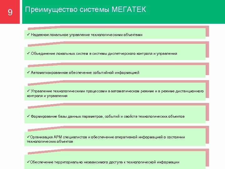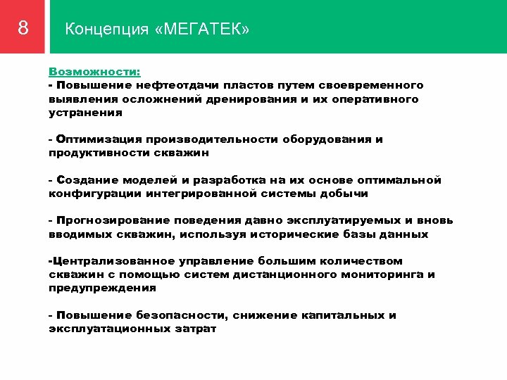 8 Концепция «МЕГАТЕК» Возможности: - Повышение нефтеотдачи пластов путем своевременного выявления осложнений дренирования и их оперативного устранения - Оптимизация производительности оборудования и продуктивности скважин - Создание моделей и разработка на их основе оптимальной конфигурации интегрированной системы добычи - Прогнозирование поведения давно эксплуатируемых и вновь вводимых скважин, используя исторические базы данных -Централизованное управление большим количеством скважин с помощью систем дистанционного мониторинга и предупреждения - Повышение безопасности, снижение капитальных и эксплуатационных затрат