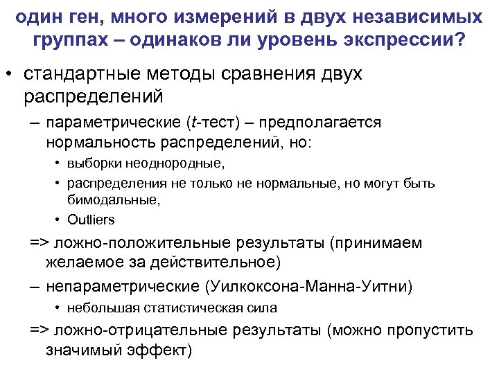 один ген, много измерений в двух независимых группах – одинаков ли уровень экспрессии? • стандартные методы сравнения двух распределений – параметрические (t-тест) – предполагается нормальность распределений, но: • выборки неоднородные, • распределения не только не нормальные, но могут быть бимодальные, • Outliers => ложно-положительные результаты (принимаем желаемое за действительное) – непараметрические (Уилкоксона-Манна-Уитни) • небольшая статистическая сила => ложно-отрицательные результаты (можно пропустить значимый эффект)