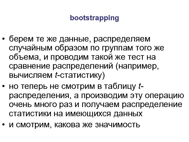 bootstrapping • берем те же данные, распределяем случайным образом по группам того же объема, и проводим такой же тест на сравнение распределений (например, вычисляем t-статистику) • но теперь не смотрим в таблицу tраспределения, а производим эту операцию очень много раз и получаем распределение статистики на имеющихся данных • и смотрим, какова же значимость