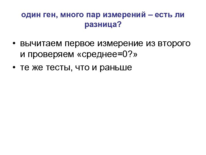 один ген, много пар измерений – есть ли разница? • вычитаем первое измерение из второго и проверяем «среднее=0? » • те же тесты, что и раньше