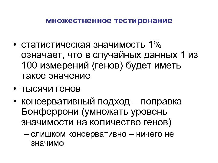множественное тестирование • статистическая значимость 1% означает, что в случайных данных 1 из 100 измерений (генов) будет иметь такое значение • тысячи генов • консервативный подход – поправка Бонферрони (умножать уровень значимости на количество генов) – слишком консервативно – ничего не значимо