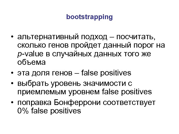 bootstrapping • альтернативный подход – посчитать, сколько генов пройдет данный порог на p-value в случайных данных того же объема • эта доля генов – false positives • выбрать уровень значимости с приемлемым уровнем false positives • поправка Бонферрони соответствует 0% false positives