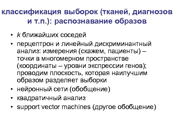 классификация выборок (тканей, диагнозов и т. п. ): распознавание образов • k ближайших соседей • перцептрон и линейный дискриминантный анализ: измерения (скажем, пациенты) – точки в многомерном пространстве (координаты – уровни экспрессии генов); проводим плоскость, которая наилучшим образом разделяет выборки • нейронный сети (обобщение) • квадратичный анализ • support vector machines (другое обобщение)