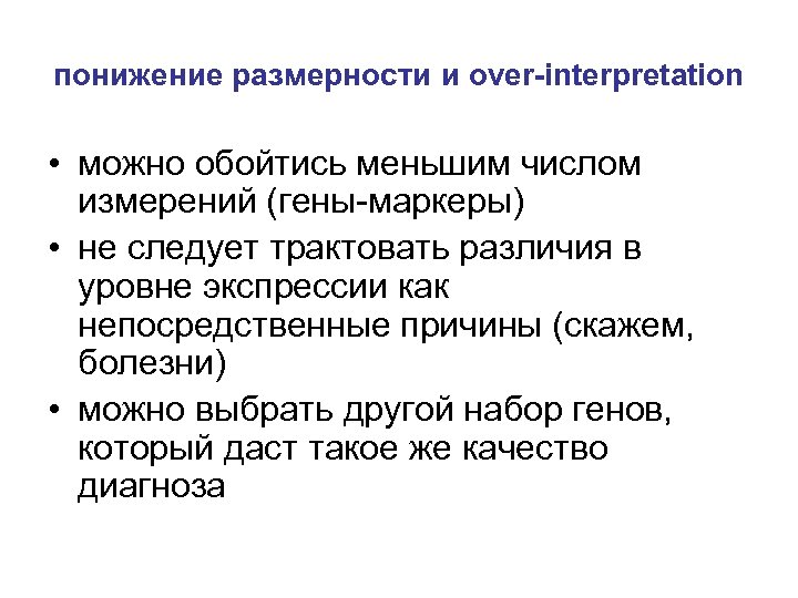 понижение размерности и over-interpretation • можно обойтись меньшим числом измерений (гены-маркеры) • не следует трактовать различия в уровне экспрессии как непосредственные причины (скажем, болезни) • можно выбрать другой набор генов, который даст такое же качество диагноза