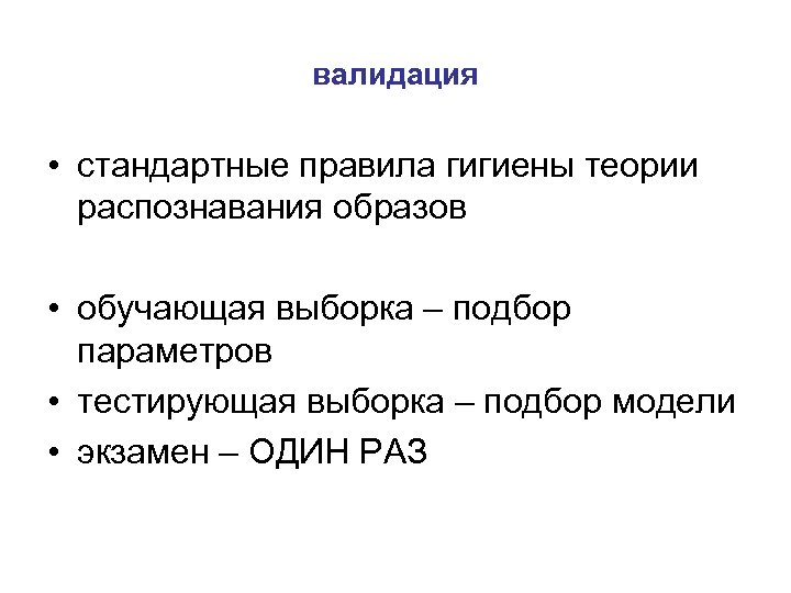 валидация • стандартные правила гигиены теории распознавания образов • обучающая выборка – подбор параметров • тестирующая выборка – подбор модели • экзамен – ОДИН РАЗ