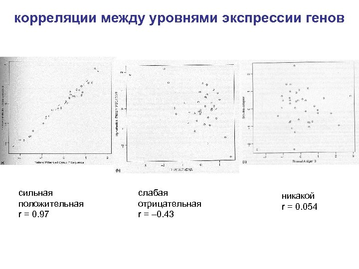 корреляции между уровнями экспрессии генов сильная положительная r = 0. 97 слабая отрицательная r = – 0. 43 никакой r = 0. 054