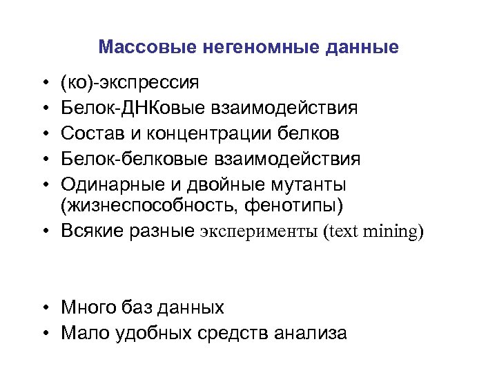 Массовые негеномные данные • • • (ко)-экспрессия Белок-ДНКовые взаимодействия Состав и концентрации белков Белок-белковые взаимодействия Одинарные и двойные мутанты (жизнеспособность, фенотипы) • Всякие разные эксперименты (text mining) • Много баз данных • Мало удобных средств анализа
