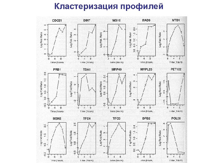 временные ряды • клеточный цикл (синхронизированные культуры) или последствия вмешательства • измерения уровней экспрессии через фиксированные отрезки времени • кластеризация полученных профилей экспрессии