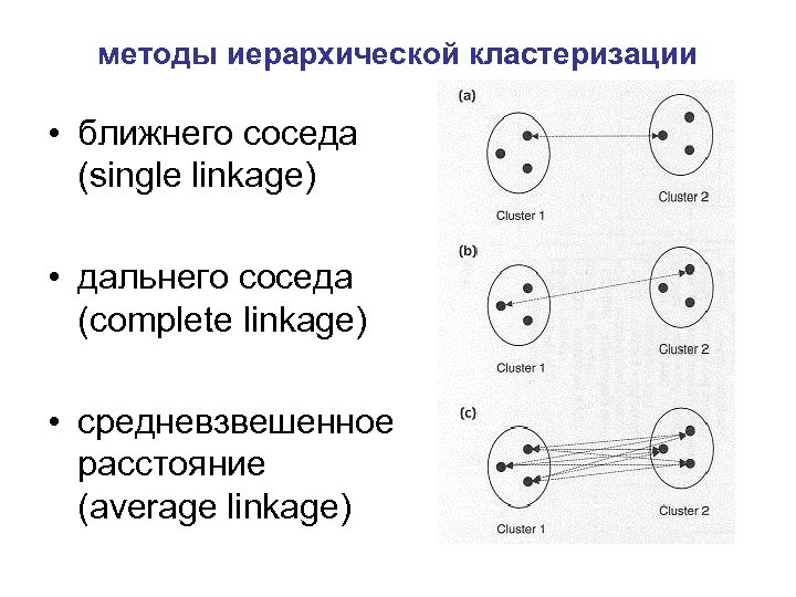 методы иерархической кластеризации • ближнего соседа (single linkage) • дальнего соседа (complete linkage) • средневзвешенное расстояние (average linkage)