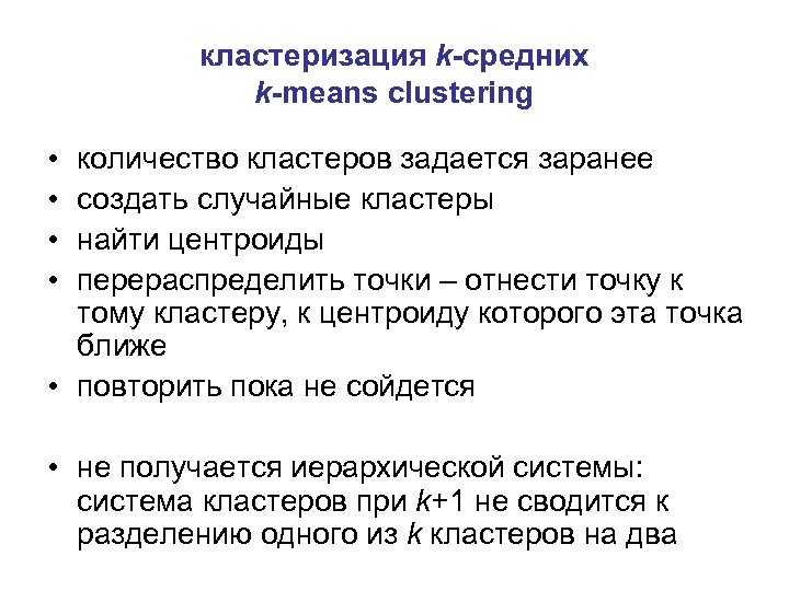 кластеризация k-средних k-means clustering • • количество кластеров задается заранее создать случайные кластеры найти центроиды перераспределить точки – отнести точку к тому кластеру, к центроиду которого эта точка ближе • повторить пока не сойдется • не получается иерархической системы: система кластеров при k+1 не сводится к разделению одного из k кластеров на два