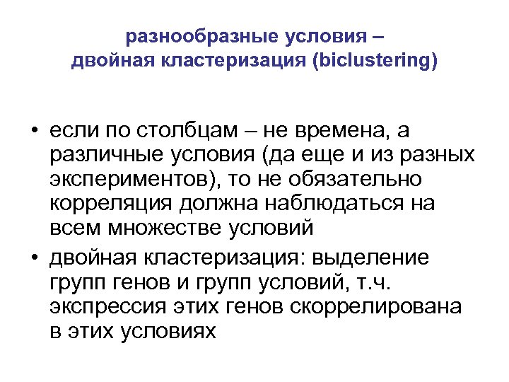 разнообразные условия – двойная кластеризация (biclustering) • если по столбцам – не времена, а различные условия (да еще и из разных экспериментов), то не обязательно корреляция должна наблюдаться на всем множестве условий • двойная кластеризация: выделение групп генов и групп условий, т. ч. экспрессия этих генов скоррелирована в этих условиях