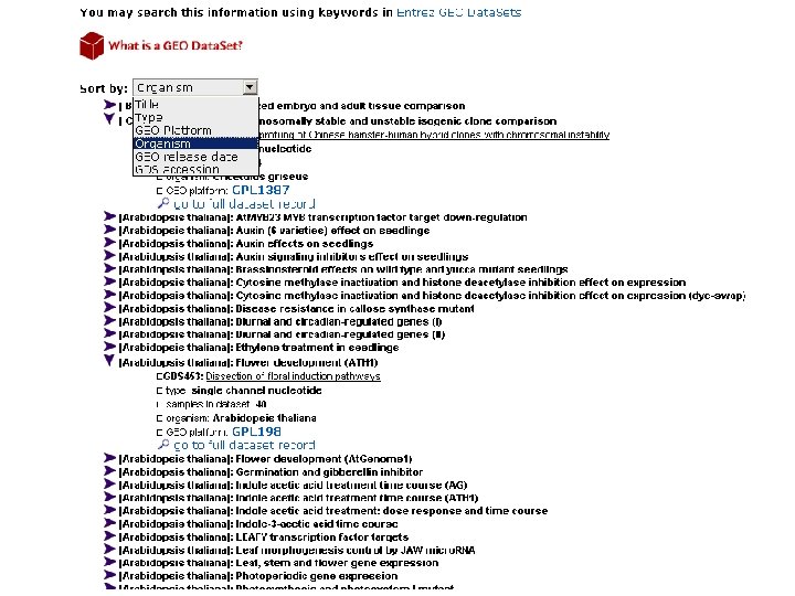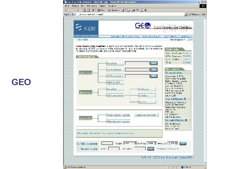 базы данных результатов экспериментов по анализу экспрессии • Array. Express http: //www. ebi. ac. uk/microarray/Array. Express/arrayxpress. html • Stanford Microarray Database http: //genome-www 5. stanford. edu/Micro. Array/NDEV/index. shtml • GEO (Gene Expression Omnibus) http: //www. ncbi. nlm. nih. gov/geo/ • Стандартизованная форма данных об эксперименте (MIAME: Minimal Iinformation About a Microarray Experiment)