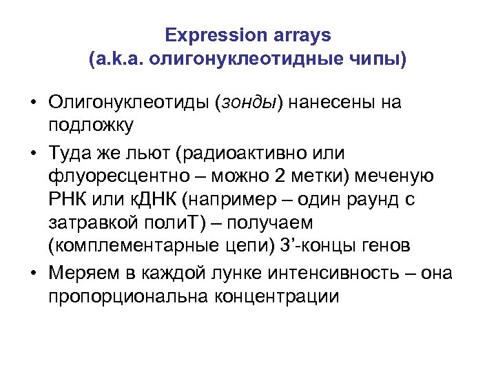 Expression arrays (a. k. a. олигонуклеотидные чипы) • Олигонуклеотиды (зонды) нанесены на подложку • Туда же льют (радиоактивно или флуоресцентно – можно 2 метки) меченую РНК или к. ДНК (например – один раунд с затравкой поли. Т) – получаем (комплементарные цепи) 3’-концы генов • Меряем в каждой лунке интенсивность – она пропорциональна концентрации