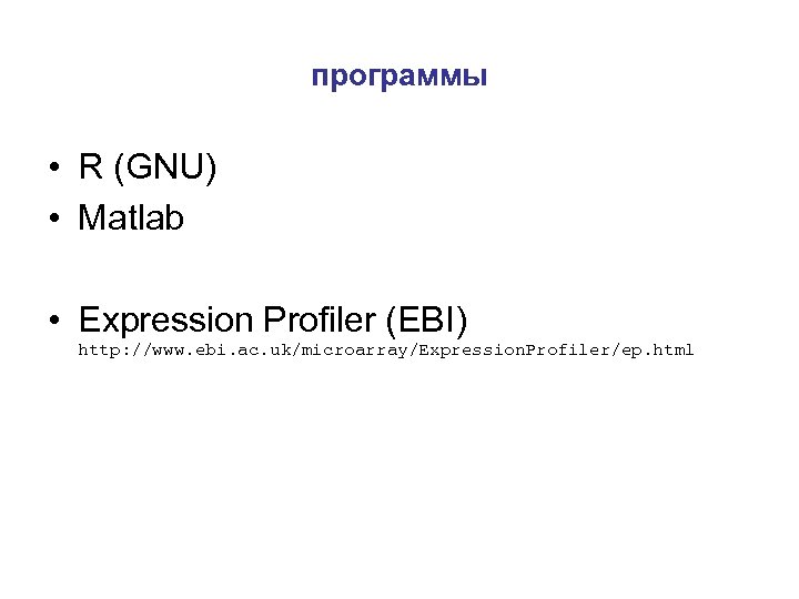 программы • R (GNU) • Matlab • Expression Profiler (EBI) http: //www. ebi. ac. uk/microarray/Expression. Profiler/ep. html